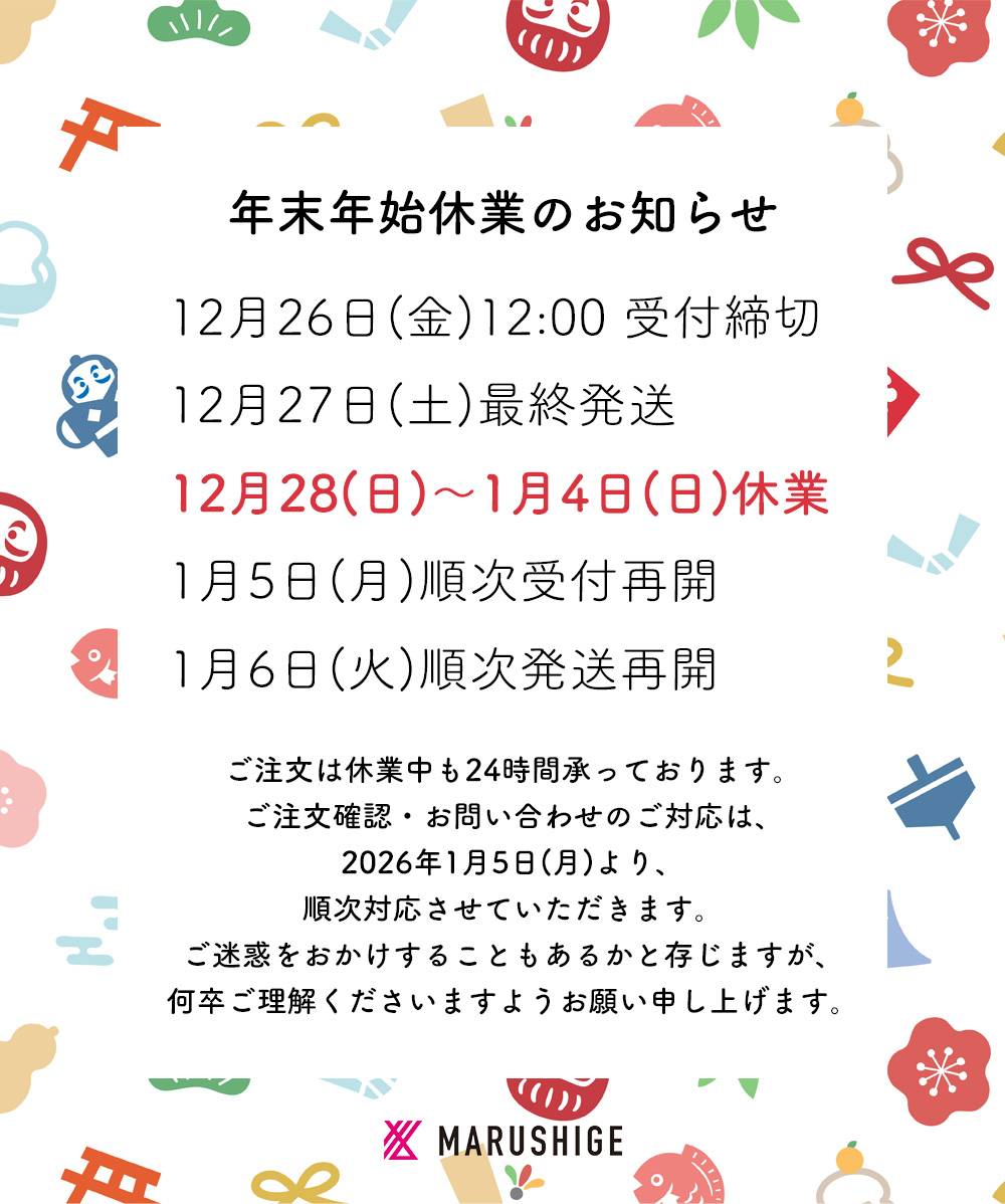 12月26日(金)12時以降にご注文頂いた場合は、1月6日(火)以降順次出荷とさせて頂きます。