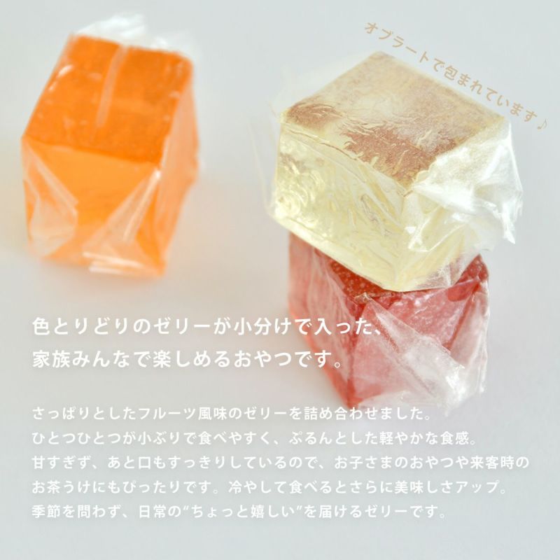色とりどりのゼリーが小分けで入った、家族みんなで楽しめるおやつです。