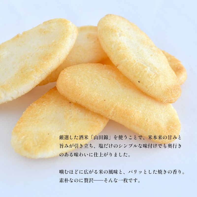 酒米の王様と称される「山田錦」を贅沢に使い、上品な香ばしさと、さっぱりとした塩味に仕上げたおせんべいです。厳選した酒米「山田錦」を使うことで、米本来の甘みと旨みが引き立ち、塩だけのシンプルな味付けでも奥行きのある味わいに仕上がりました。噛むほどに広がる米の風味と、パリッとした焼きの香り。素朴なのに贅沢、そんな一枚です。