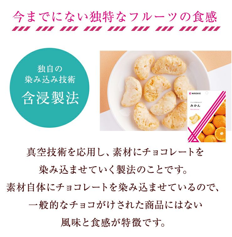 ほおばるたびに広がる甘酸っぱさと、ホワイトチョコレートのまろやかな風味が絶妙に調和した、一口で心を満たすチョコが染み込んだみかんです。