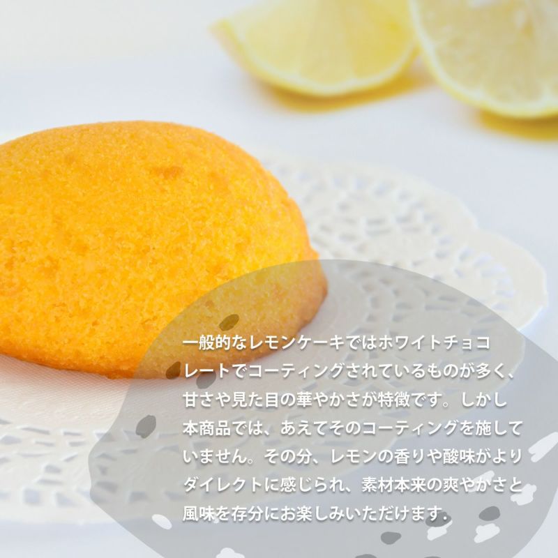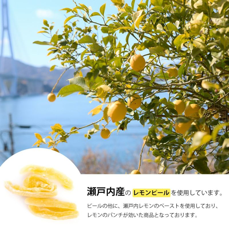瀬戸内産のレモンピールを使用した洋菓子です。ピールの他に、瀬戸内レモンのペーストを使用しており、レモンのパンチが効いた商品となっております。一般的なレモンケーキではホワイトチョコレートでコーティングされているものが多く、甘さや見た目の華やかさが特徴です。しかし本商品では、あえてそのコーティングを施していません。その分、レモンの香りや酸味がよりダイレクトに感じられ、素材本来の爽やかさと風味を存分にお楽しみいただけます。