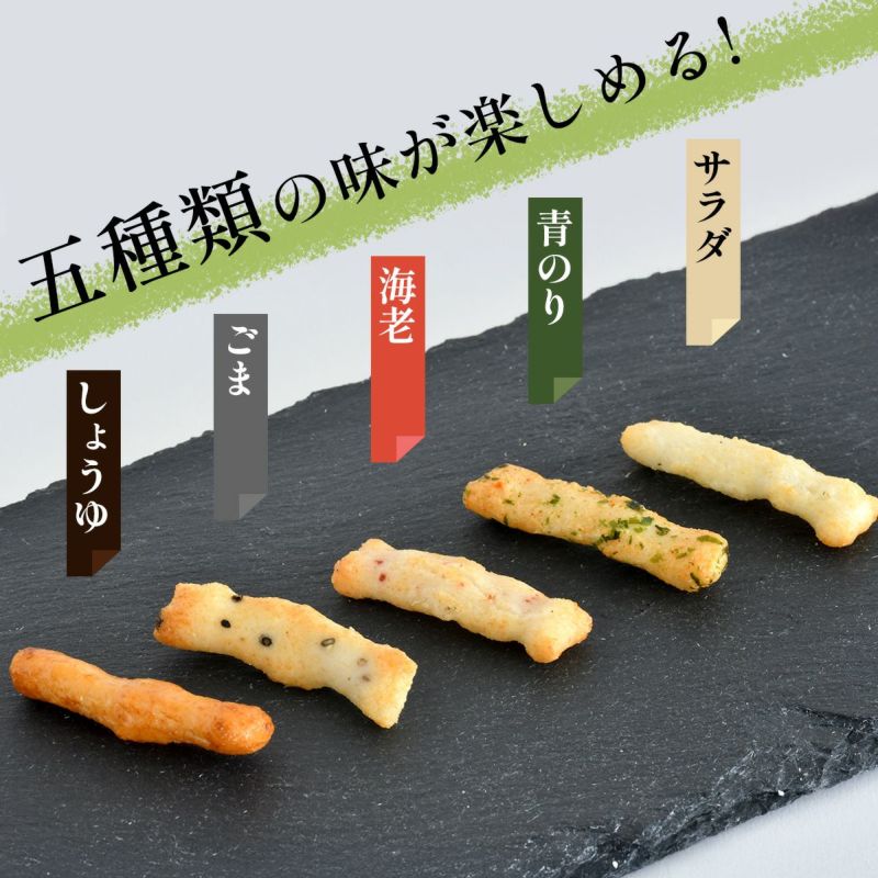 国内産もち米を100%使用。5種類のあられを楽しめます!