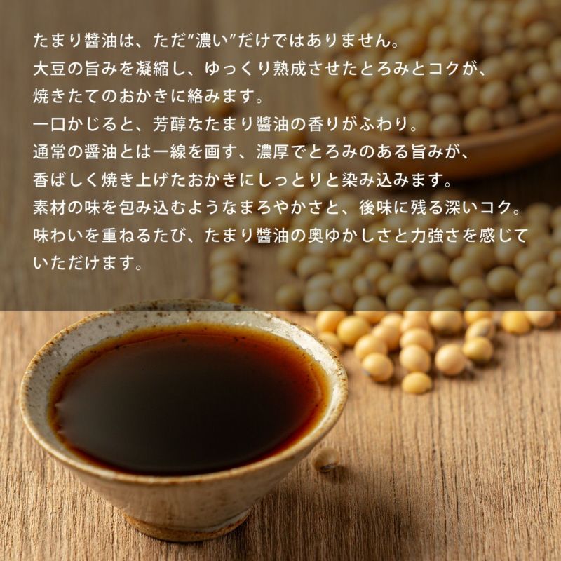 極薄に焼き上げたおかき「特上千枚」は、サクッと軽いのに、旨みはしっかり。厳選されたもち米と、香ばしい醤油が重なり合い、一枚、また一枚と、つい手が伸びるおいしさです。たまり醬油は、ただ“濃い”だけではありません。大豆の旨みを凝縮し、ゆっくり熟成させたとろみとコクが、焼きたてのおかきに絡みます。