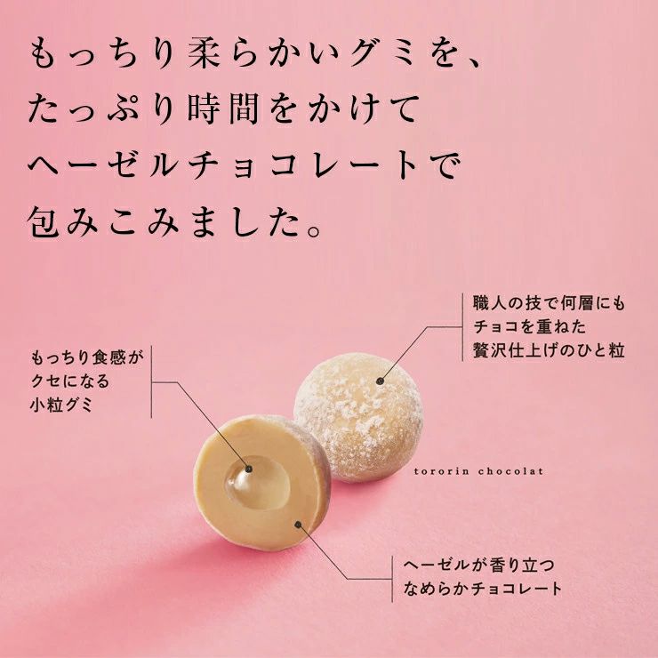 もっちり柔らかいグミを、とろけるようなヘーゼルチョコレートで包み込んだ一粒は、職人の技で何層にもチョコを重ねています。その贅沢な仕上がりは、一度食べたら忘れられない美味しさです。