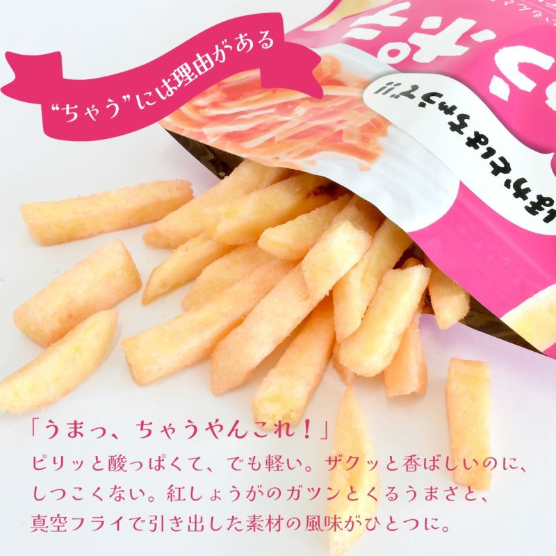 「うまっ、他のお菓子とはひと味ちゃうやんこれ!」 ピリッと酸っぱくて、でも軽い。 ザクッと香ばしいのに、しつこくない。 紅しょうがのガツンとくるうまさと、 真空フライで引き出した素材の風味がひとつになった新商品のスナック菓子。大阪のソウルフードとして親しまれている「紅しょうが」味。口に入れる前からふわっと香り、紅しょうがの香気がクセになります。お子様でも美味しく食べれて、アテにもなる濃い味。大阪土産としてもおすすめです!
